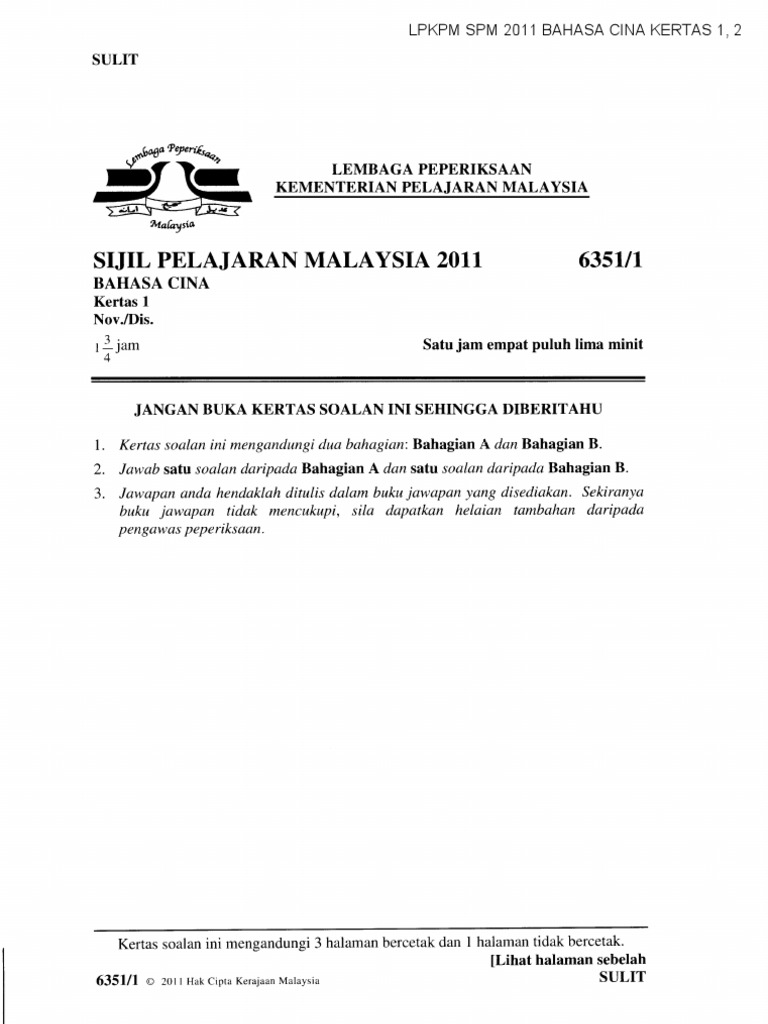 Lpkpm Spm 2011 Bahasa Cina Kertas 1 2 Pdf